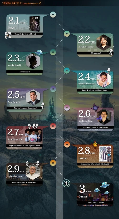 “ The Download Starter is a project where the number of downloads for Terra Battle determines content being unlocked such as artists creating new art, new game modes, and the production of books and action figures. ”